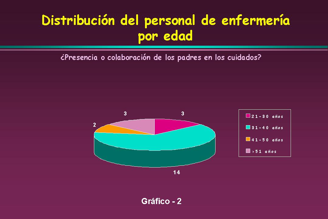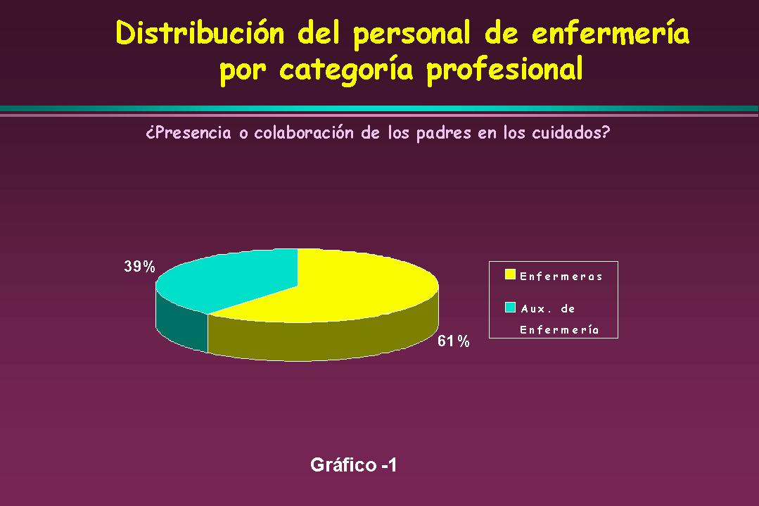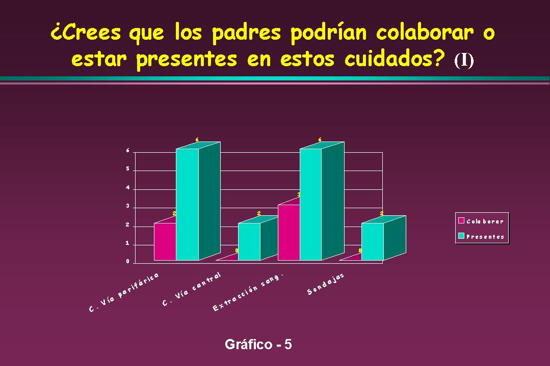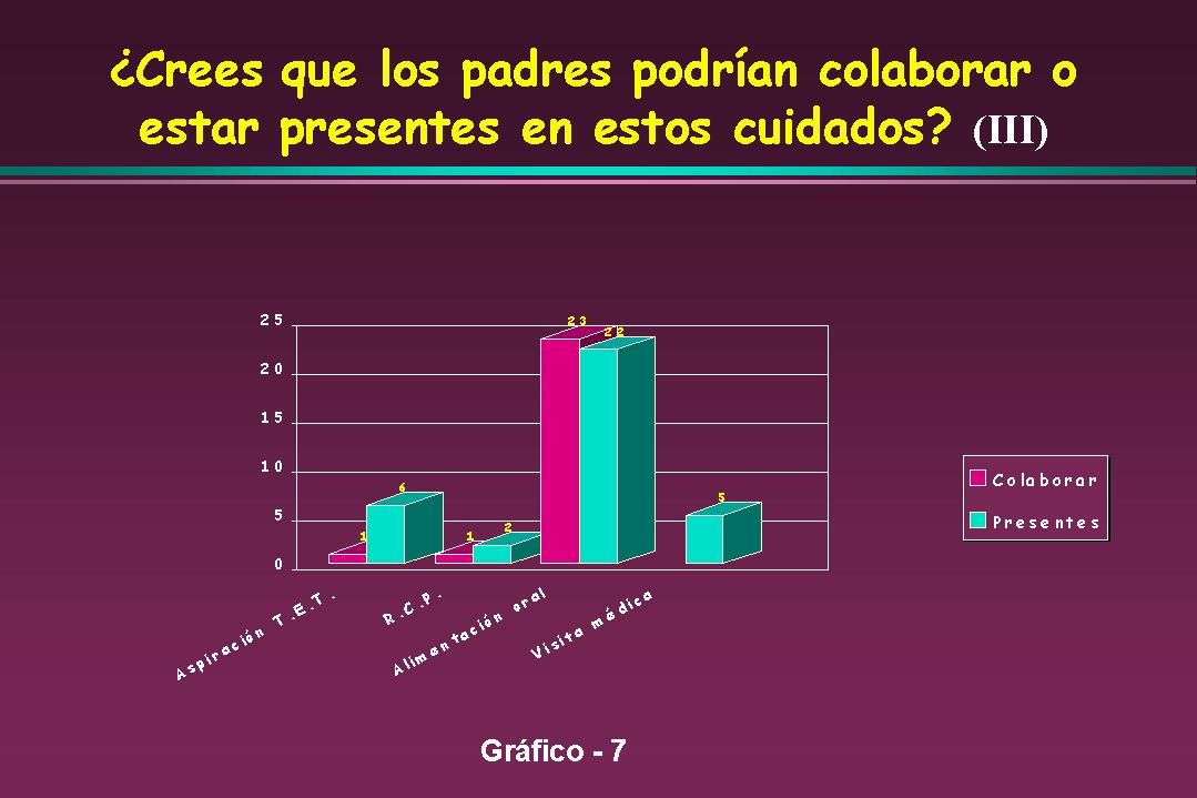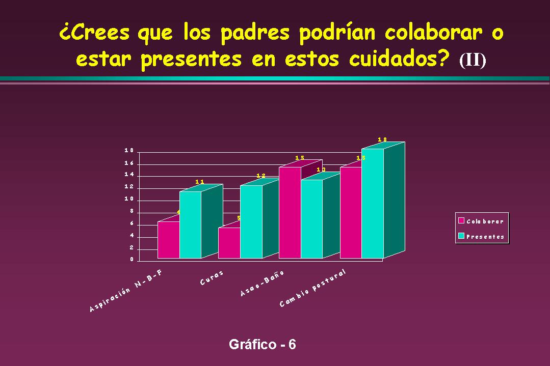 Con respecto al segundo objetivo planteado, encontramos que el personal no parece estar de acuerdo en que los padres colaboren en los cuidados, excepto en el aseo-baño, cambio postural y en la alimentación oral. Es posible que se deba a que el concepto de colaboración lo entiendan exclusivamente como de ayuda en la realización de la técnica y no en la atención psicológica que debe darse al niño para proporcionar una atención integral de calidad.