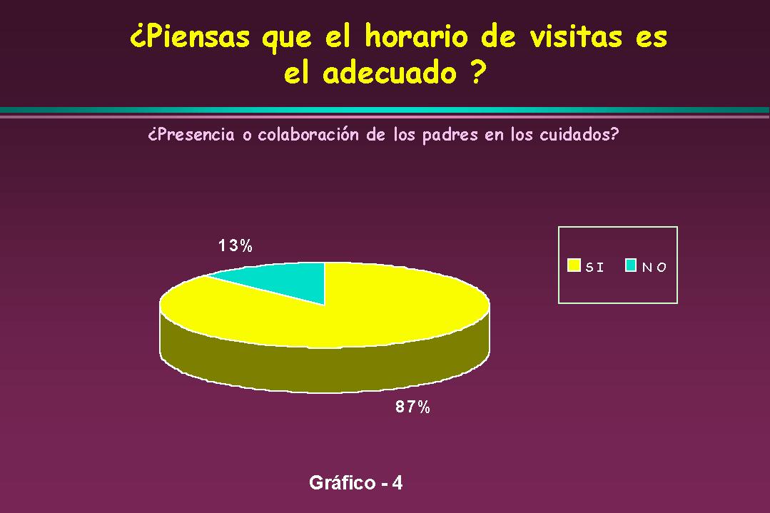 A las que respondieron que no, un 13 % (3), se les realizó una pregunta abierta acerca de cuál sería su horario idóneo y por qué, contestando en un caso que sería conveniente retrasar la primera visita de la mañana; en otro caso manifestó que los padres deberian estar siempre, respetando las horas de sueño y la realización de técnicas, y la tercera persona que no estaba de acuerdo con el horario oficial actual hacía referencia a flexibilizar el horario dependiendo de las circunstancias.